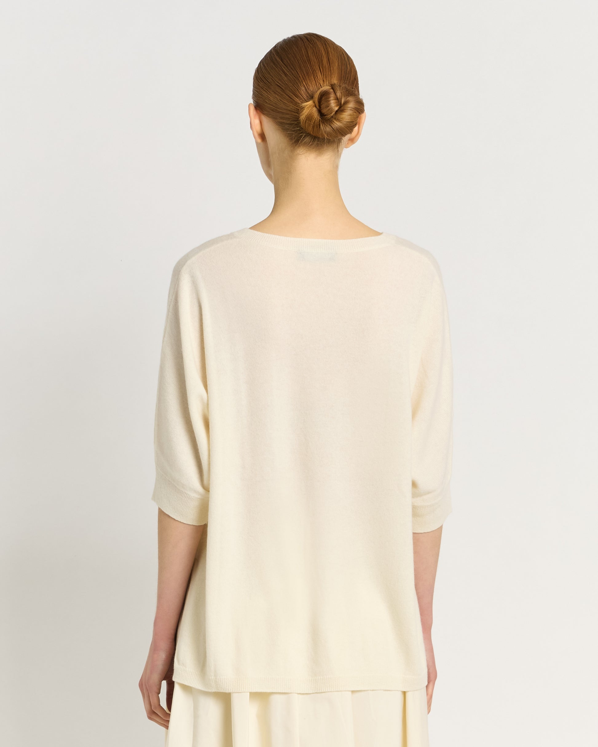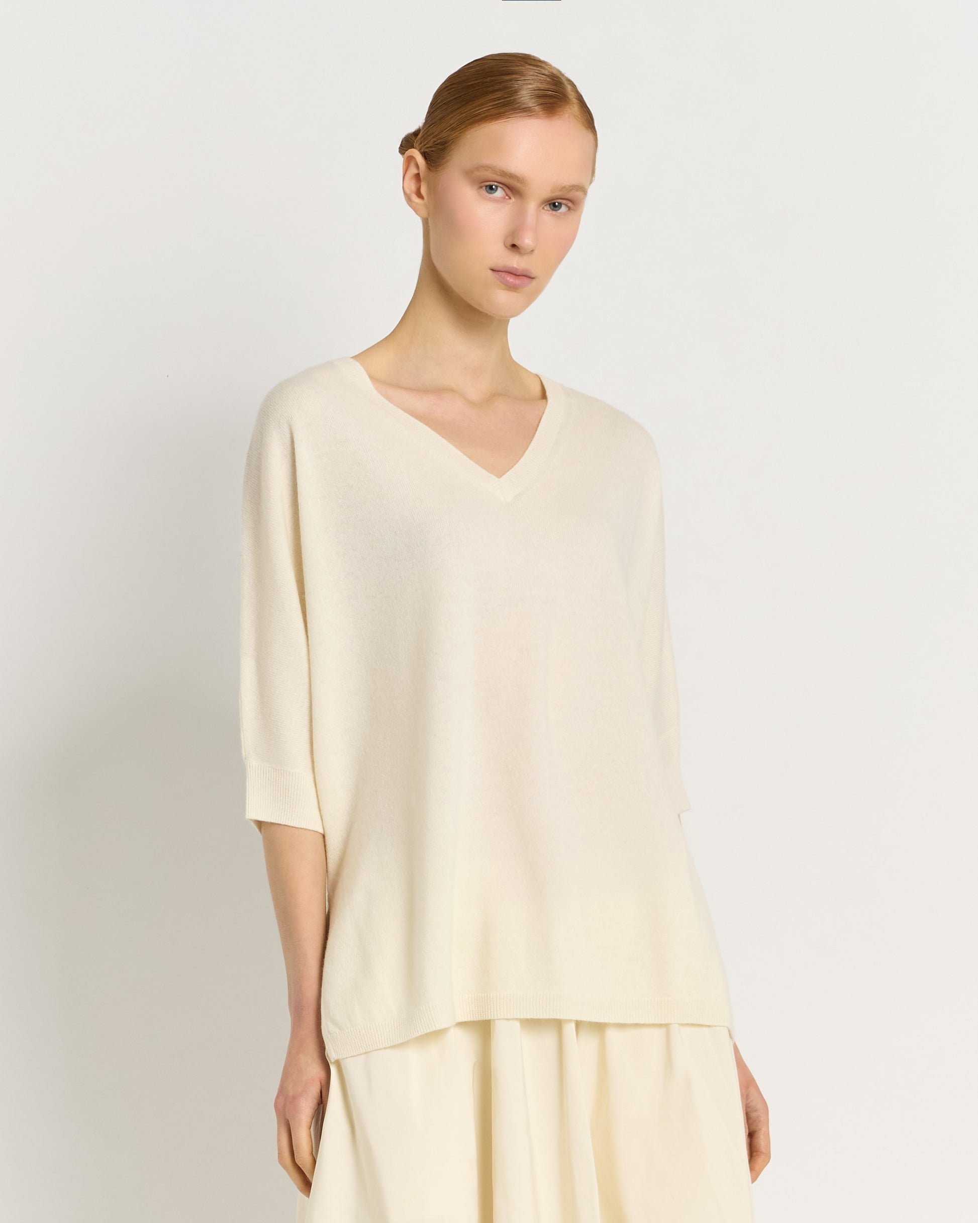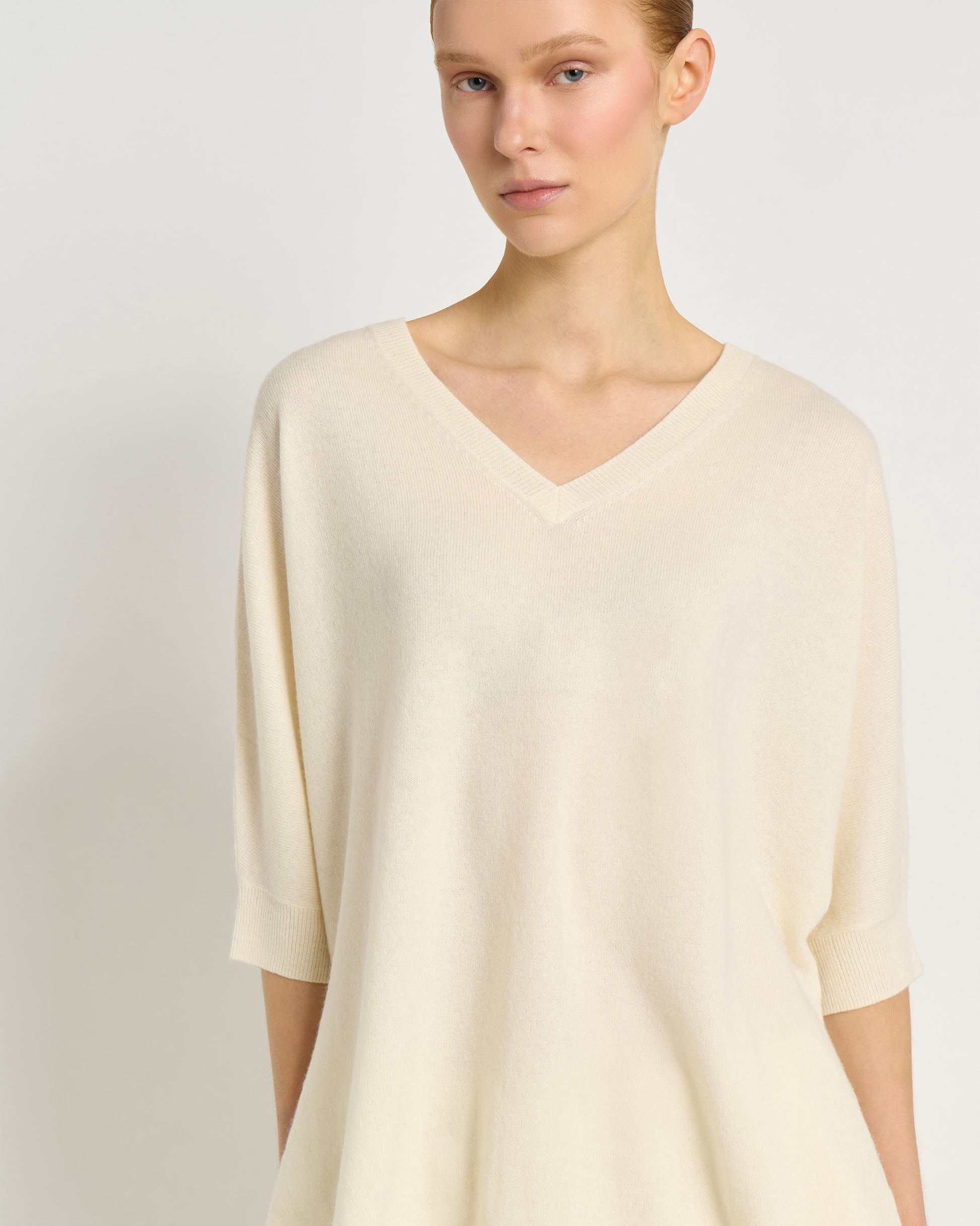 Linee morbide, materiali nobili e dettagli pensati per esaltare la femminilità: questa maglia con scollo a V over è realizzata in una pregiata miscela di lana extrafine e cashmere, che garantisce comfort assoluto e un’eleganza essenziale.