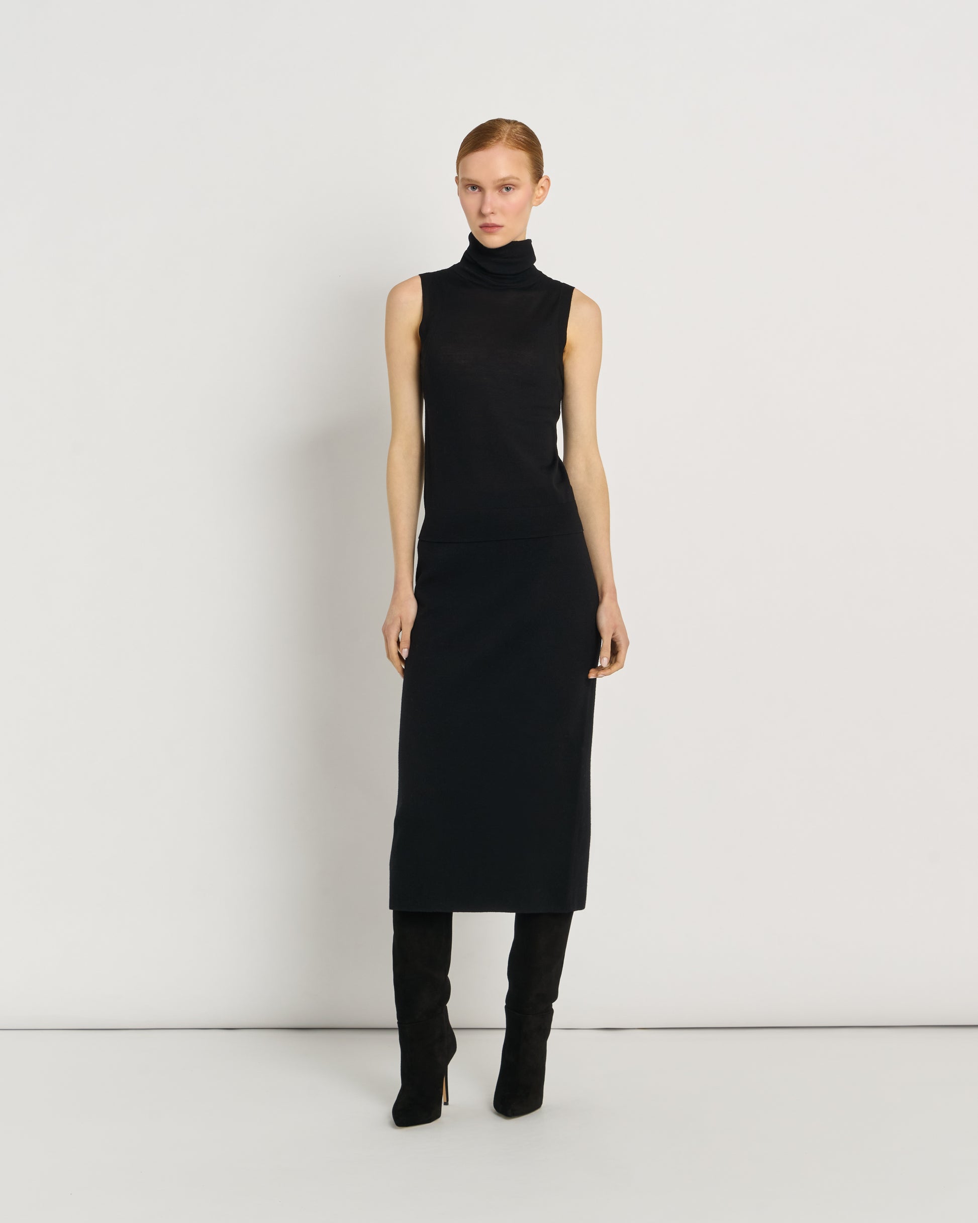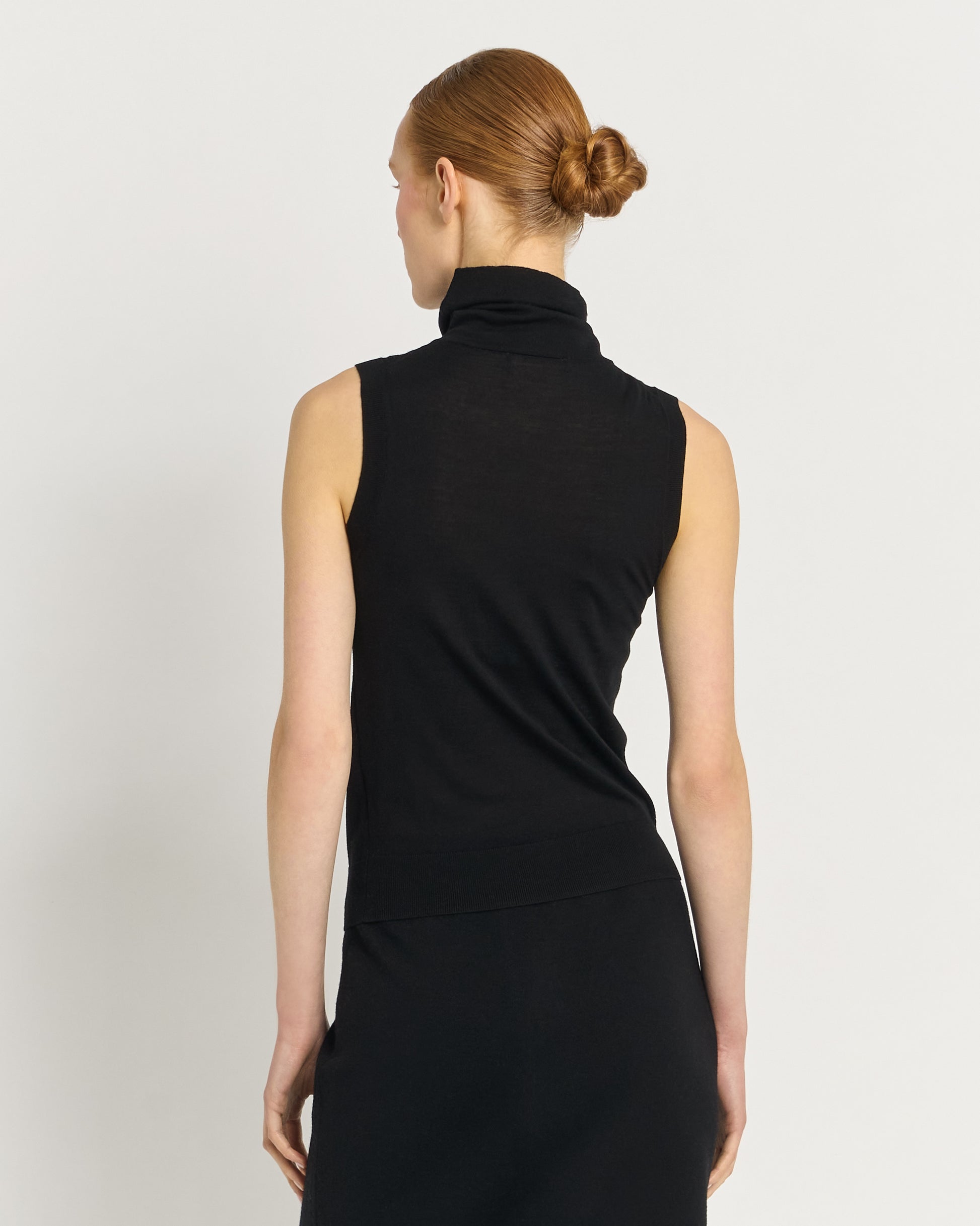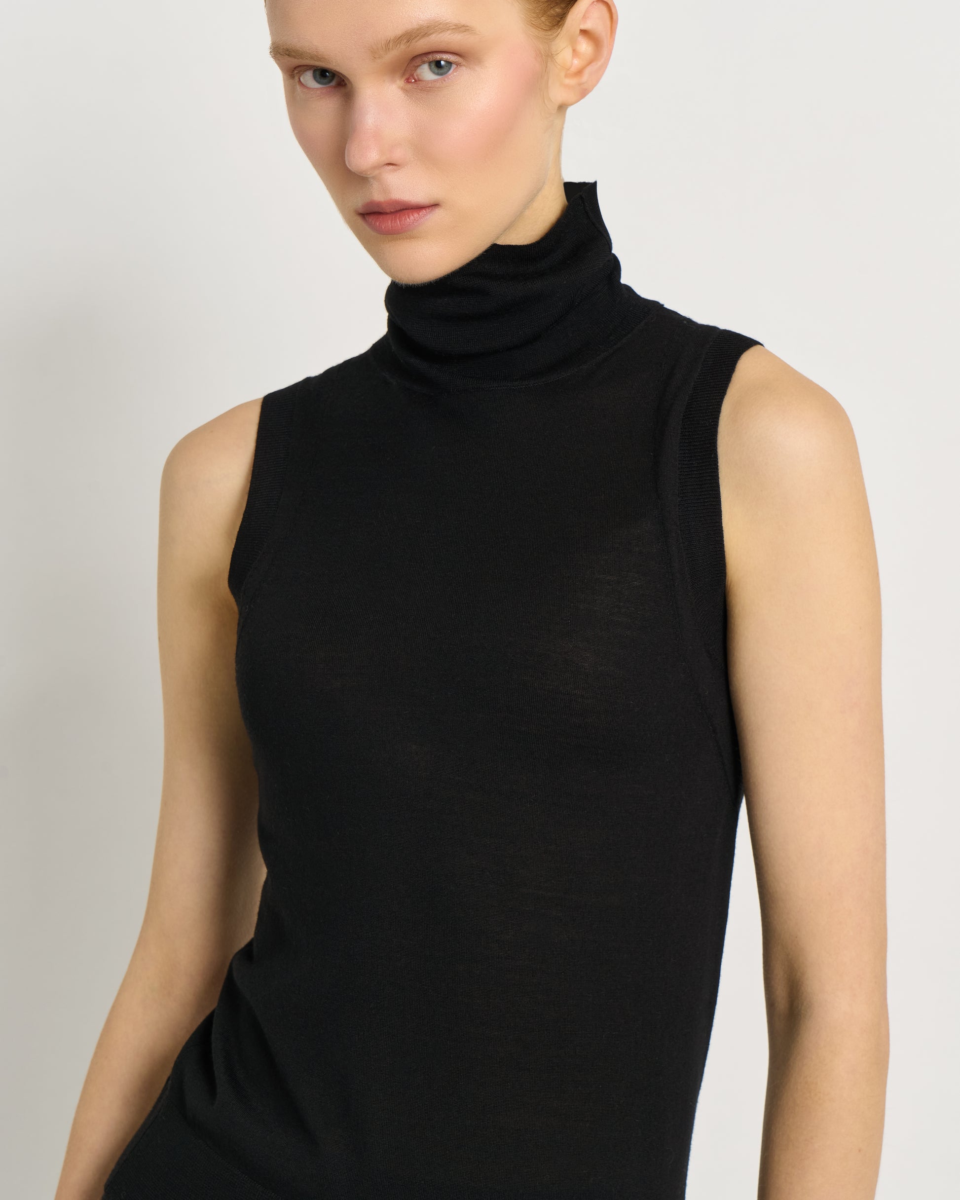Un capo essenziale e trasversale, questo dolcevita smanicato è realizzato in 100% lana merino superfine, un filato pregiato noto per la sua morbidezza, traspirabilità e comfort termico. Il design minimalista è esaltato dalla linea asciutta e pulita, mentre il collo alto aggiunge struttura e carattere al capo.