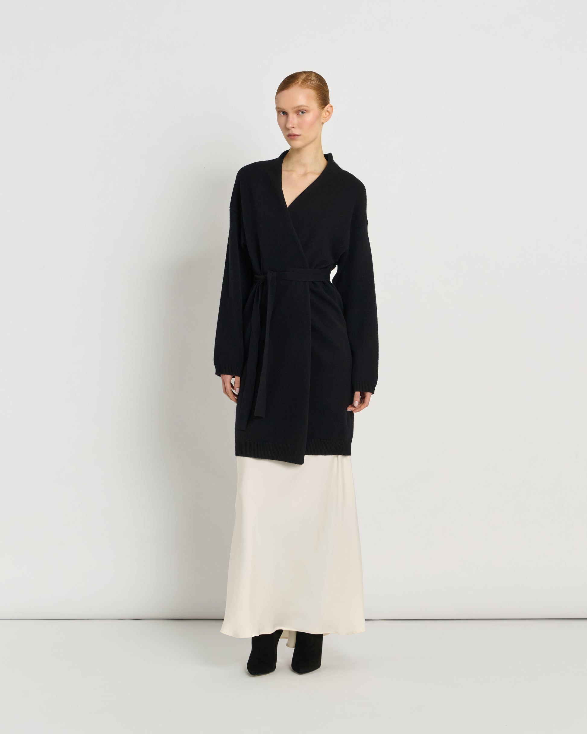 Avvolgente e raffinato, questo maxi cardigan con cintura è realizzato in 100%Lana merino extrafine, selezionata per la sua straordinaria morbidezza, traspirabilità e comfort termico. Scollo a V ampio e morbido incornicia delicatamente il viso e dona movimento al capo.